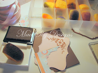 4. Since the twist on this sketch was to use distressing, I wanted to ink the sides of the patterned paper. I took some left over pieces and experimented with ink colors. I ended up going with SU's mellow moss. At this point I didn't have a panel on top of my card base. I decided to use matching Mellow Moss cardstock and embossed it with a Cuttlebug folder that I haven't used yet.